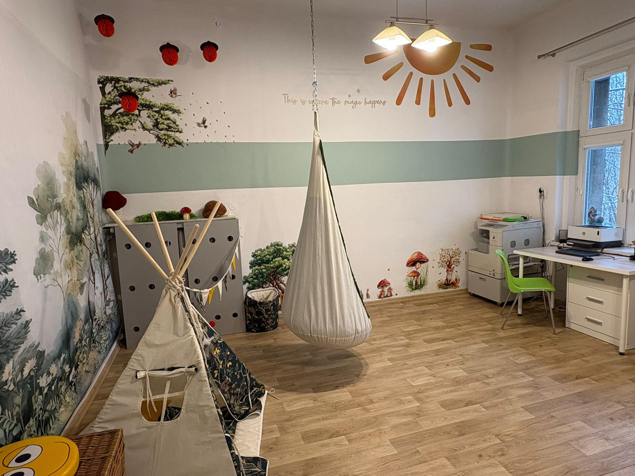 Z ogromną radością pokazujemy efekt renowacji sali, która przeszła wyjątkową metamorfozę. Przestrzeń, w której wcześniej mieścił się gabinet wicedyrektora, dziś stała się miejscem stworzonym z myślą o dzieciach – ich potrzebach, emocjach i rozwoju.
