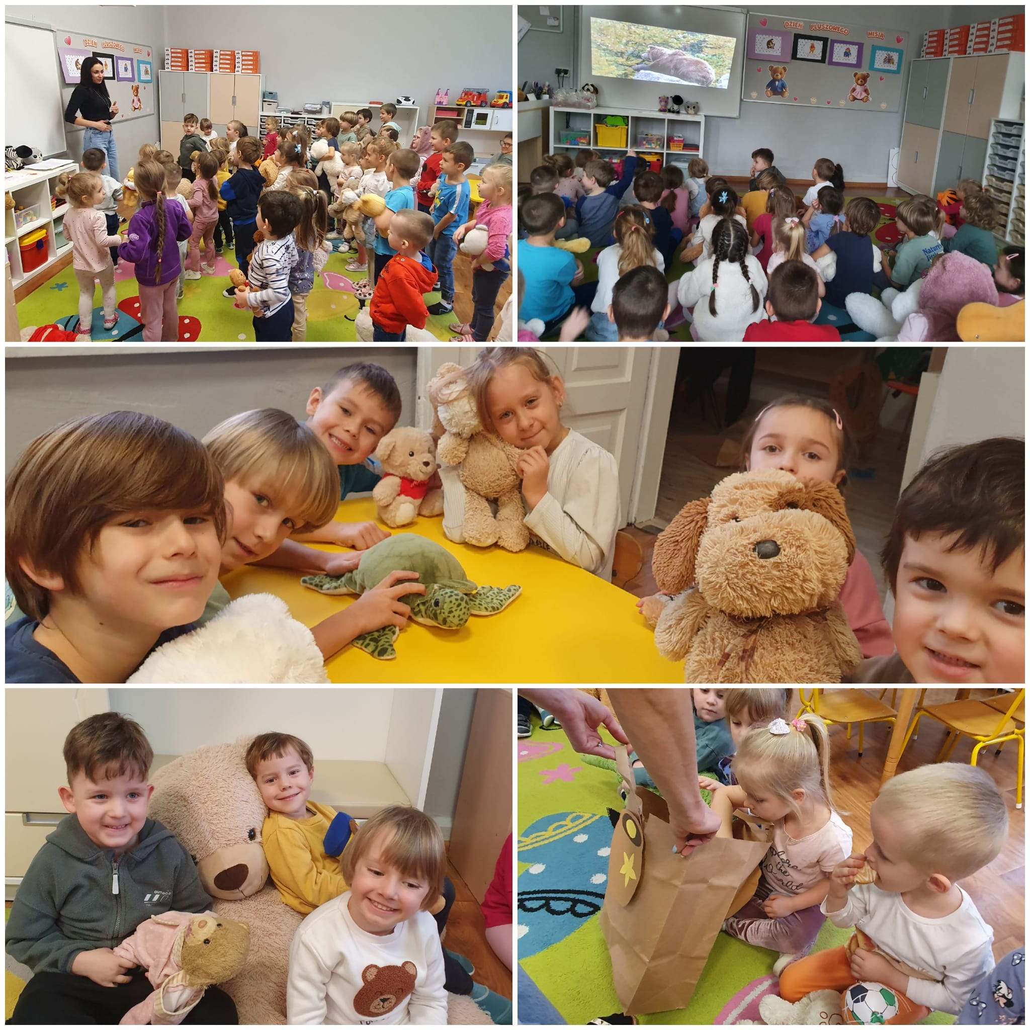 Na początku przedszkolaki obejrzały film edukacyjny, dzięki któremu poznały historię pluszowego misia. Później wszyscy świetnie bawili się podczas zabaw muzyczno-ruchowych, pełnych energii i uśmiechu. Dużo radości sprawił również taniec z misiami, w którym dzieci mogły poruszać się w rytm muzyki ze swoimi pluszowymi przyjaciółmi.