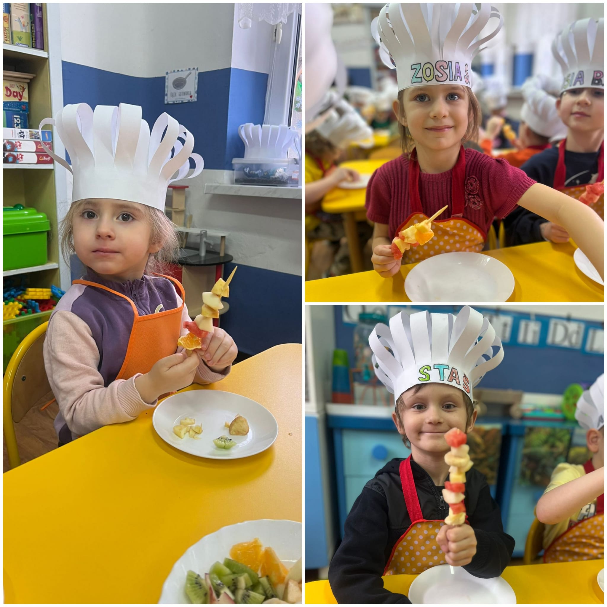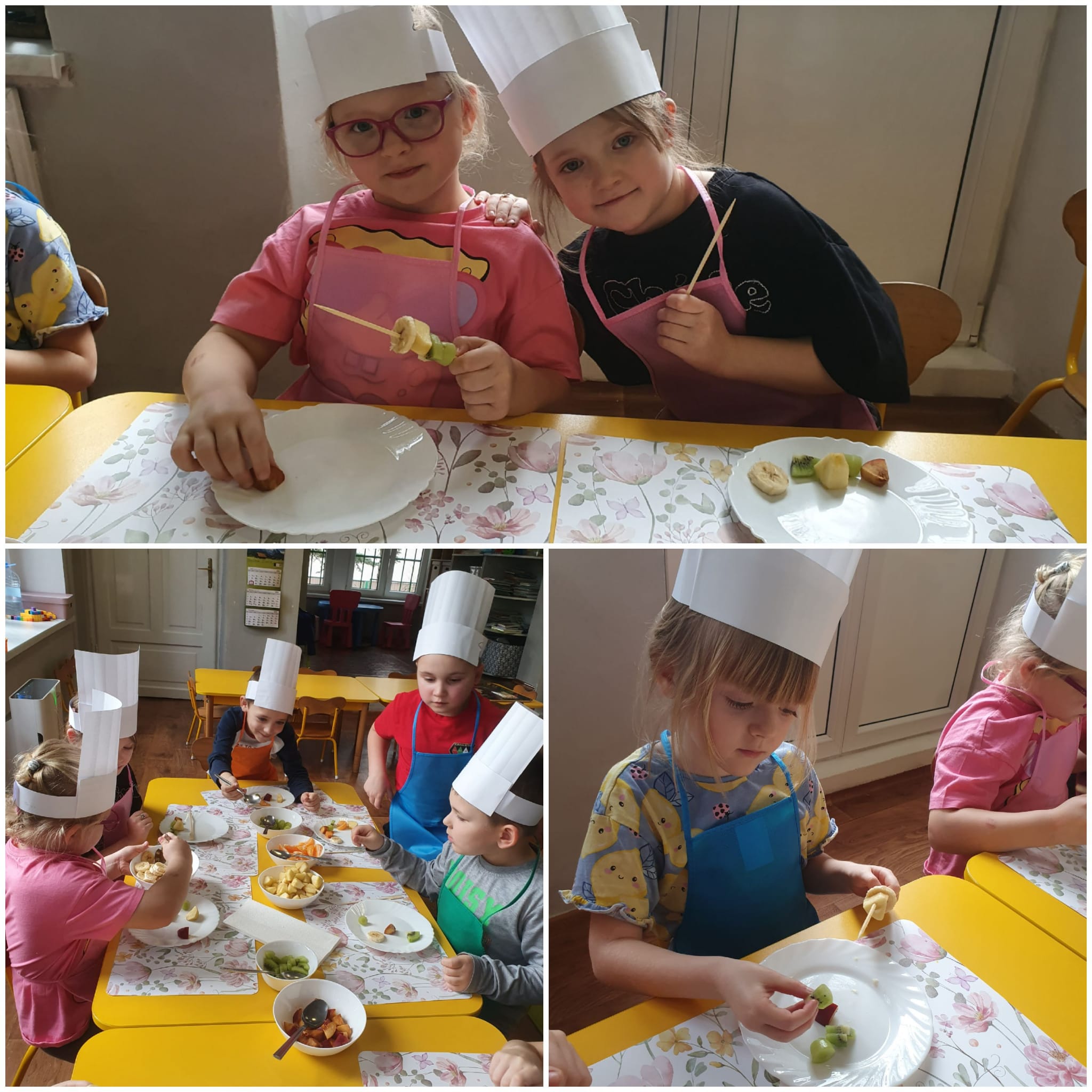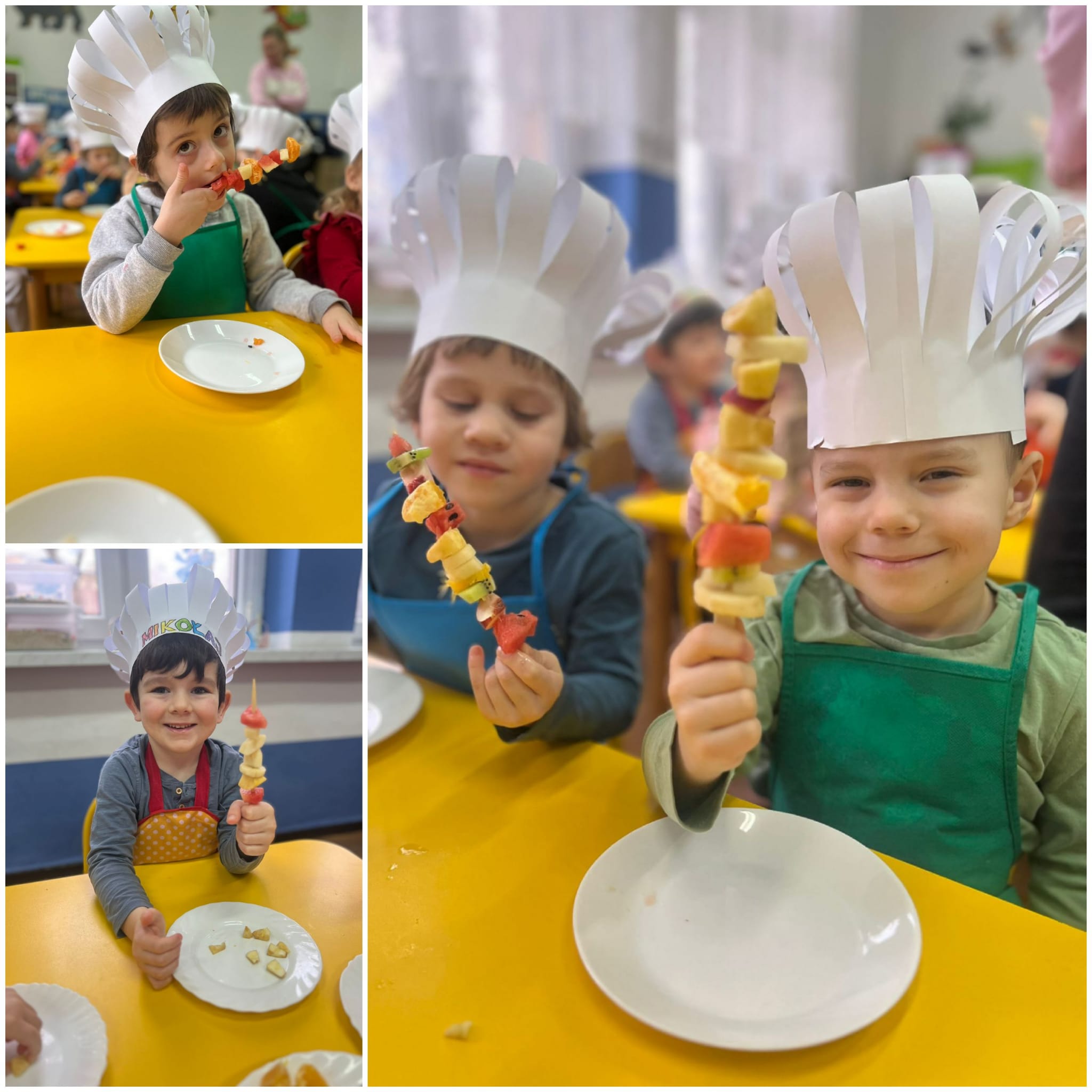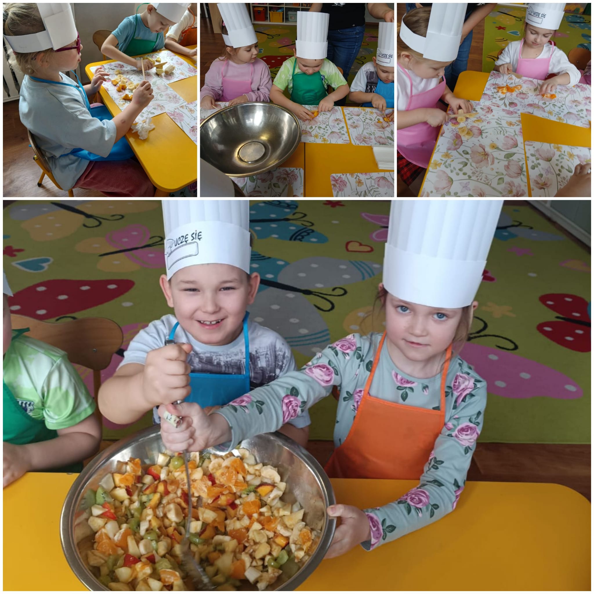 Podczas wspólnych zajęć dzieci miały okazję samodzielnie przygotować zdrowe i smaczne potrawy. Powstały sałatki owocowe, zdrowe koktajle, szaszłyki owocowe oraz kolorowe, pełnowartościowe kanapki. Na zakończenie mali kucharze przygotowali pizzę.