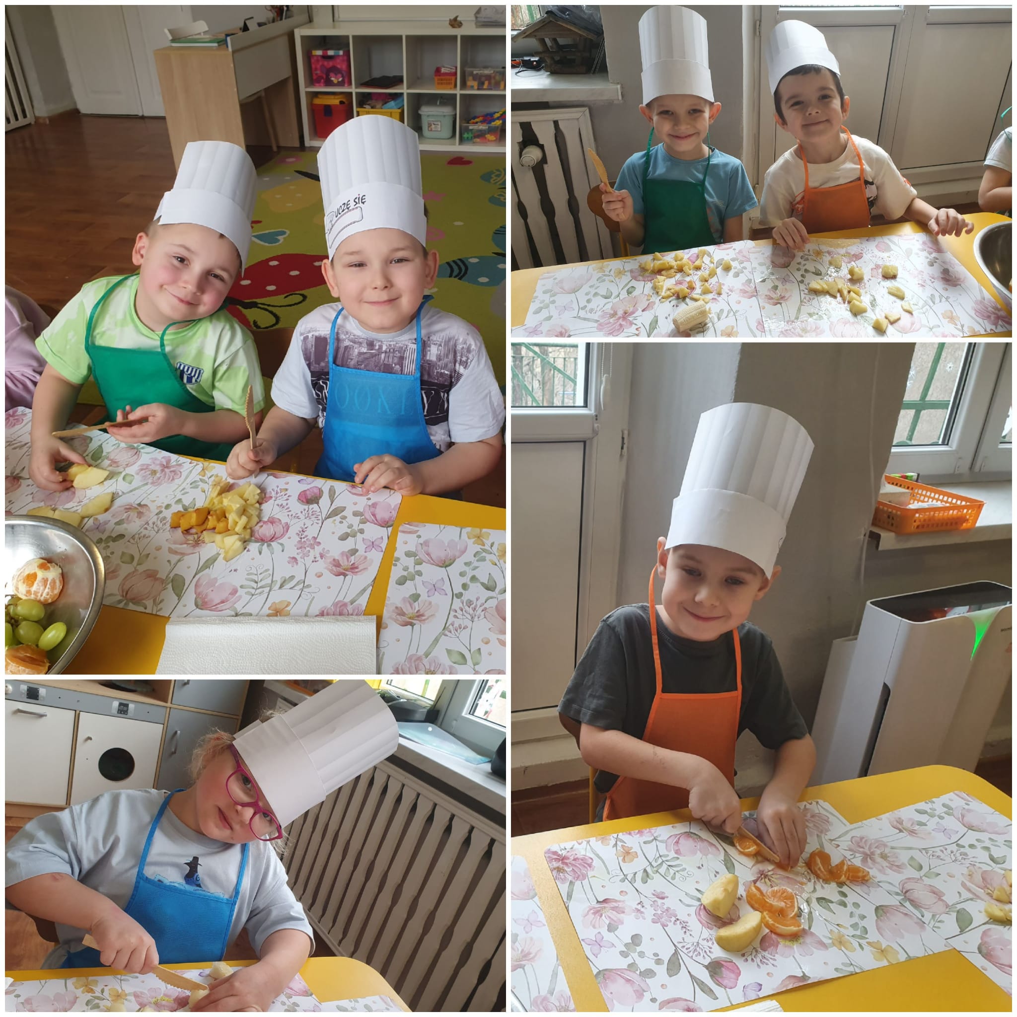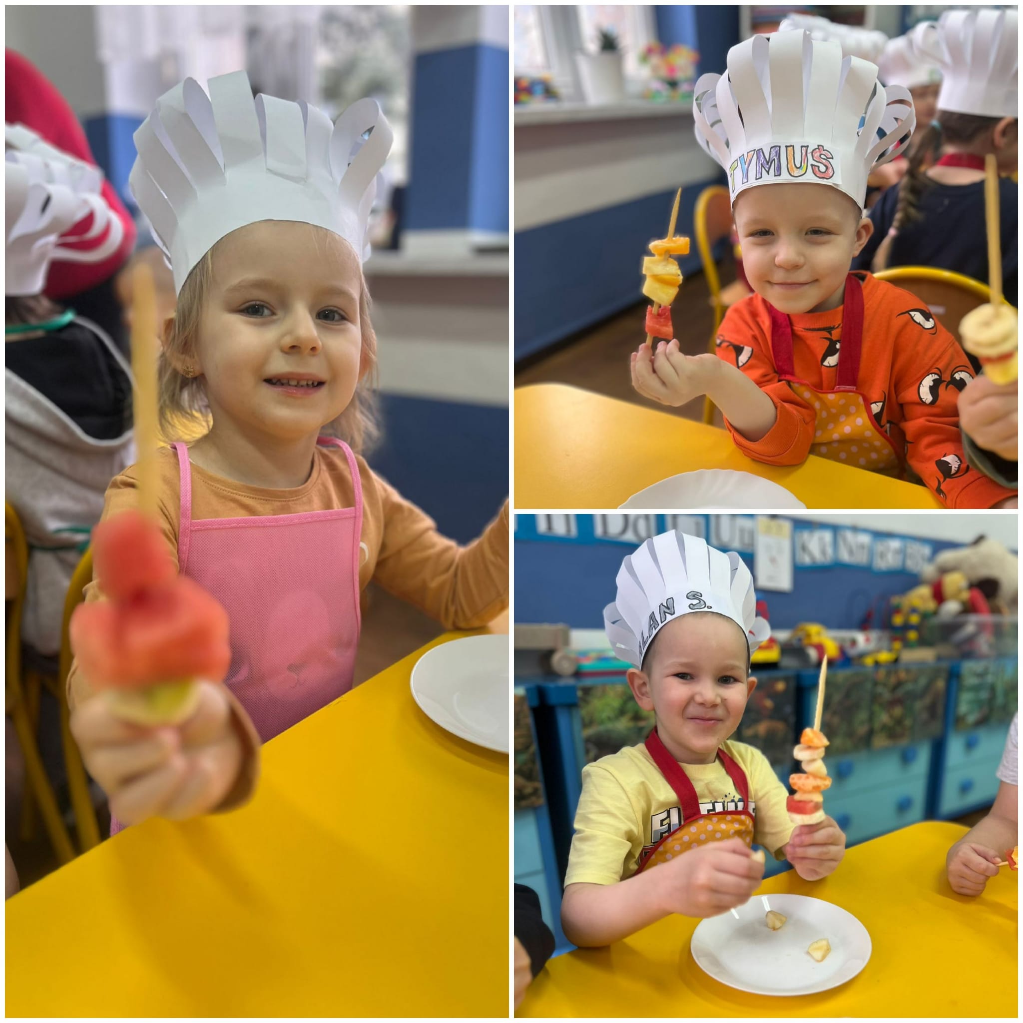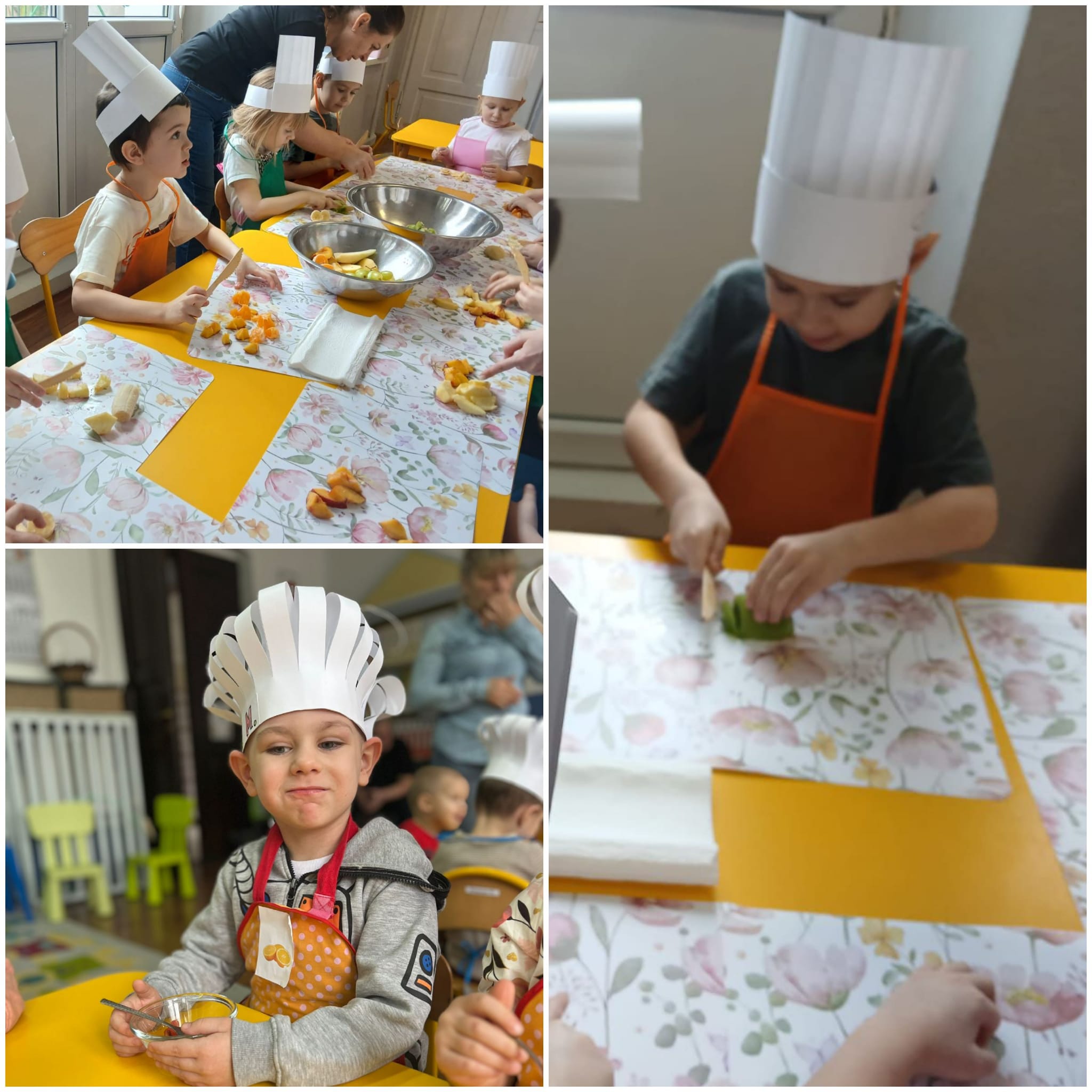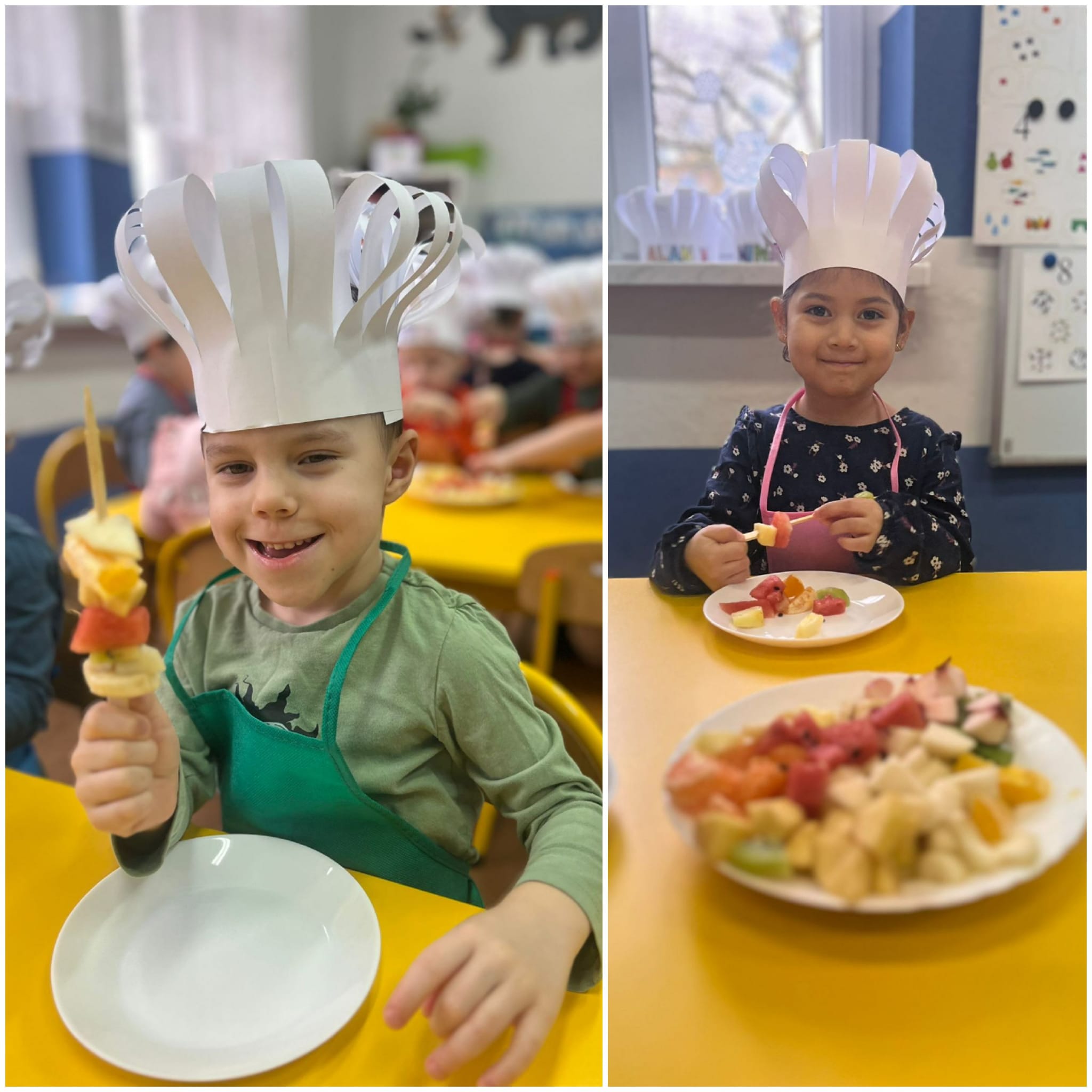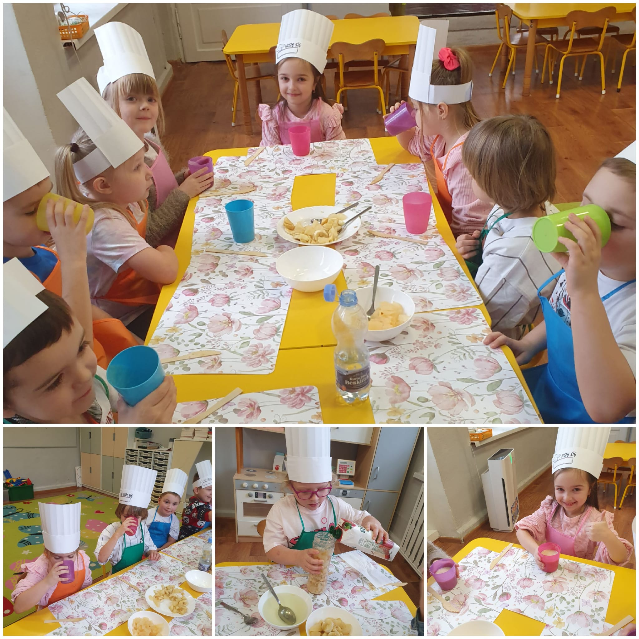 Podczas wspólnych zajęć dzieci miały okazję samodzielnie przygotować zdrowe i smaczne potrawy. Powstały sałatki owocowe, zdrowe koktajle, szaszłyki owocowe oraz kolorowe, pełnowartościowe kanapki. Na zakończenie mali kucharze przygotowali pizzę.