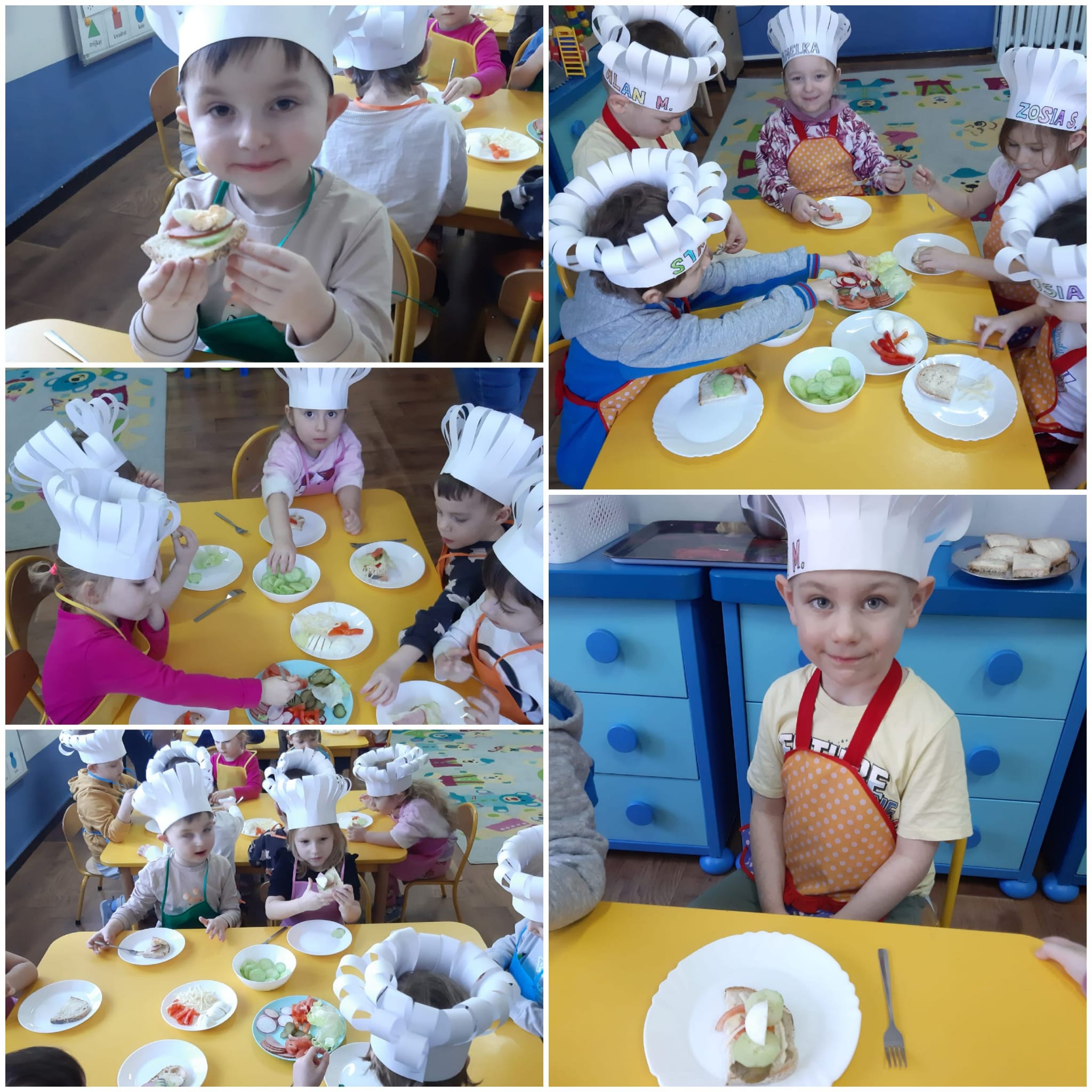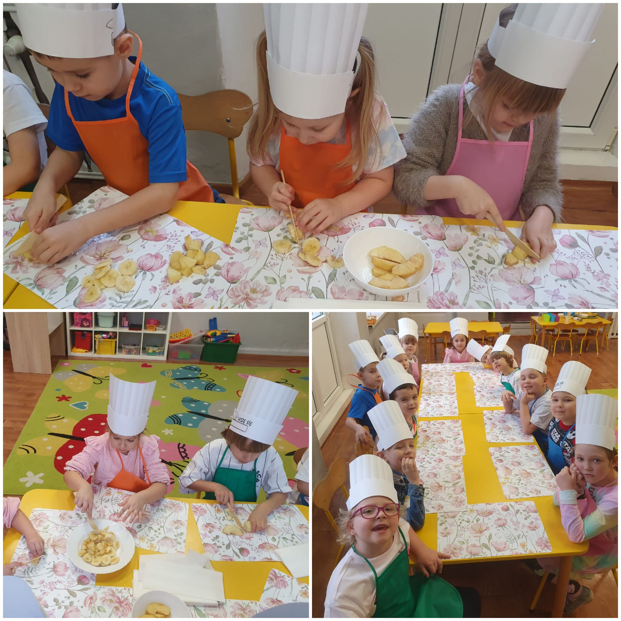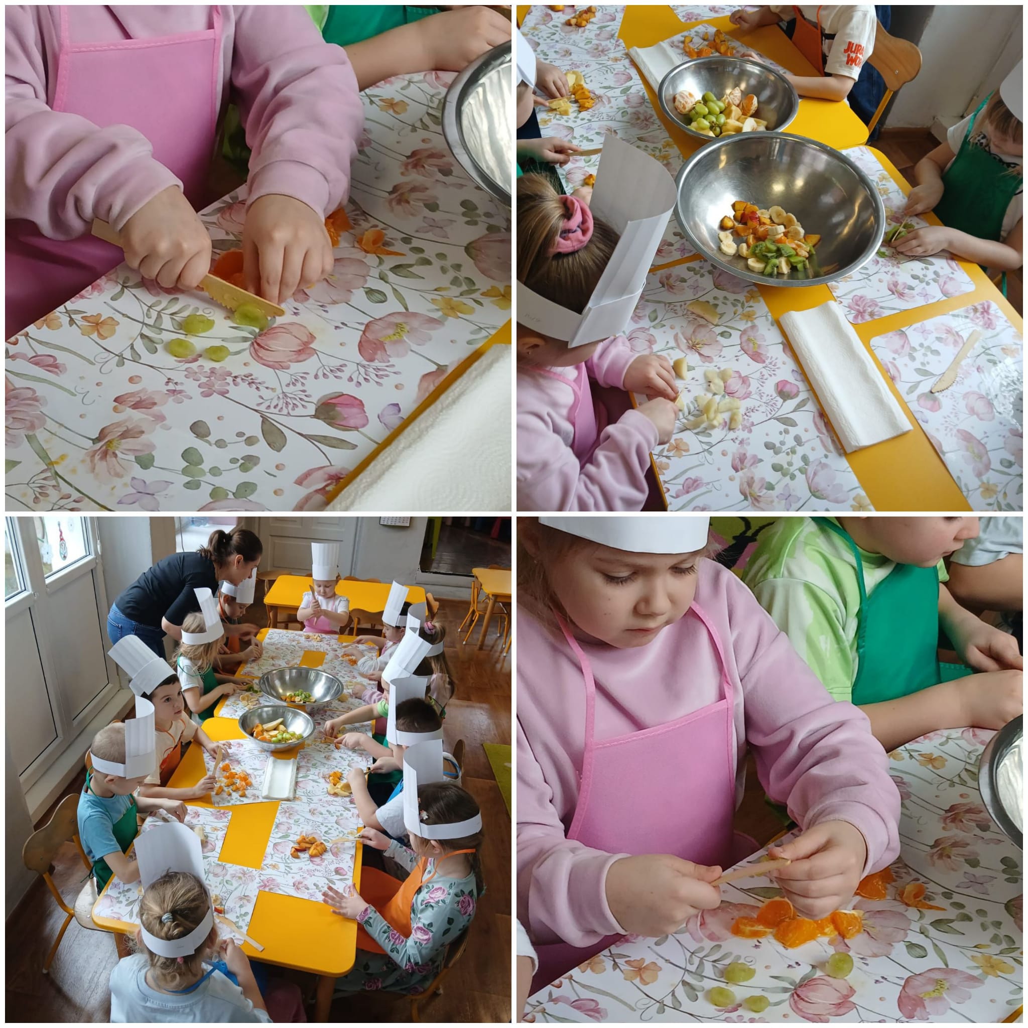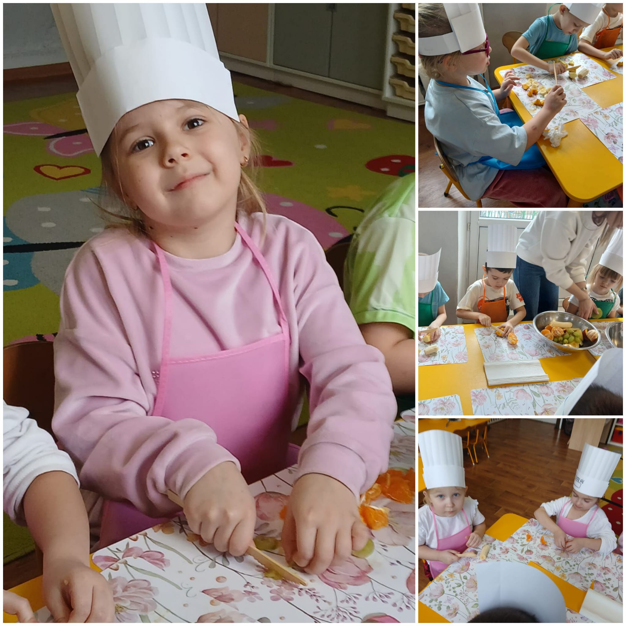 Podczas wspólnych zajęć dzieci miały okazję samodzielnie przygotować zdrowe i smaczne potrawy. Powstały sałatki owocowe, zdrowe koktajle, szaszłyki owocowe oraz kolorowe, pełnowartościowe kanapki. Na zakończenie mali kucharze przygotowali pizzę.