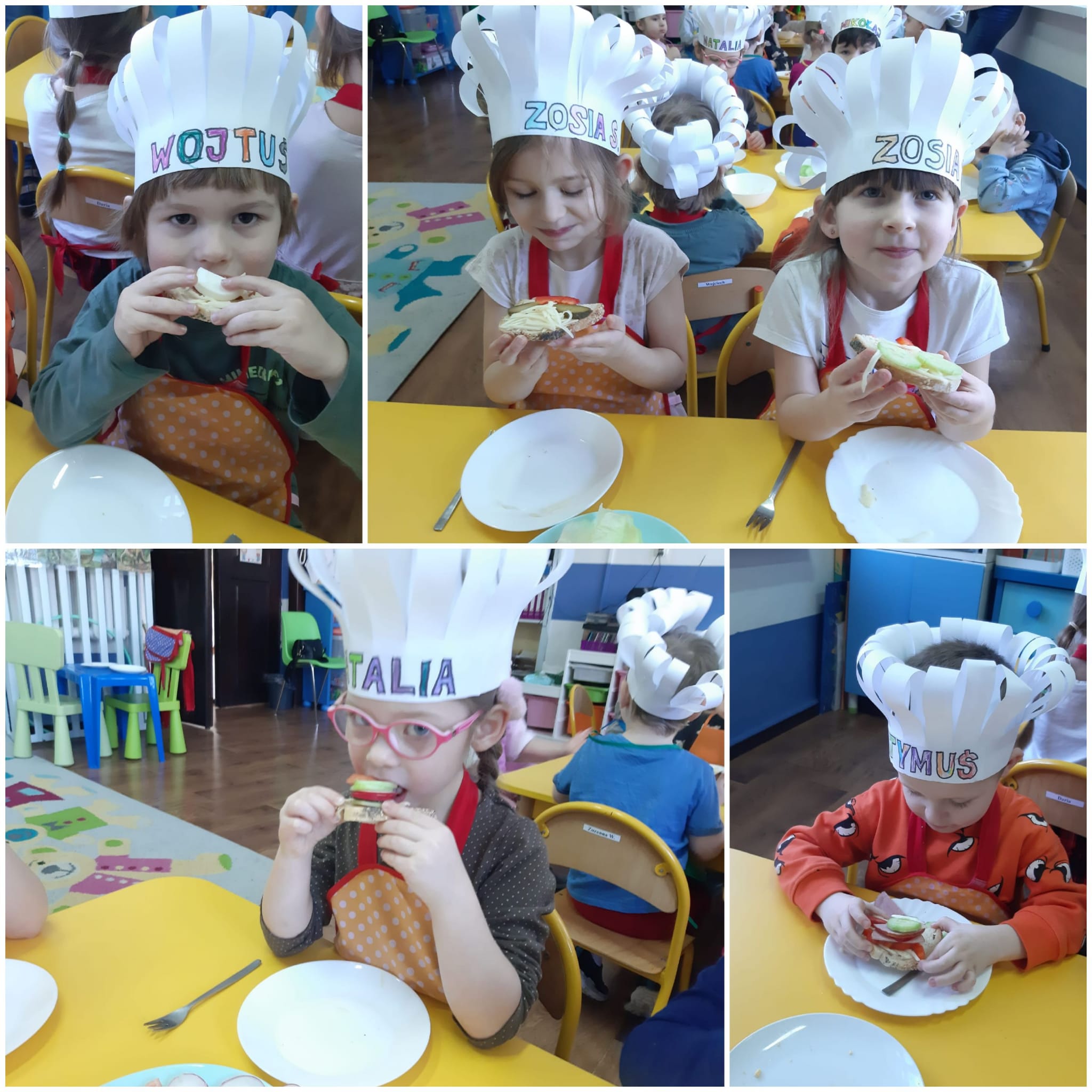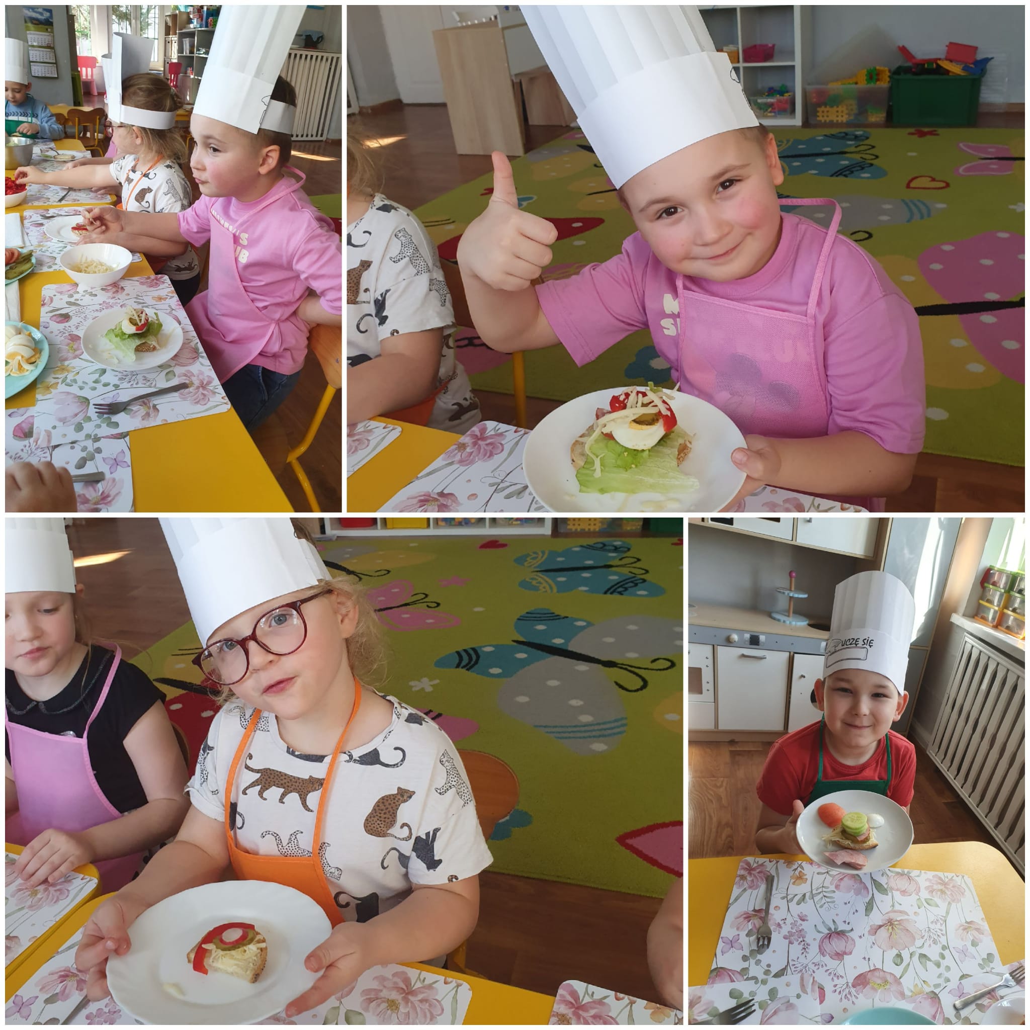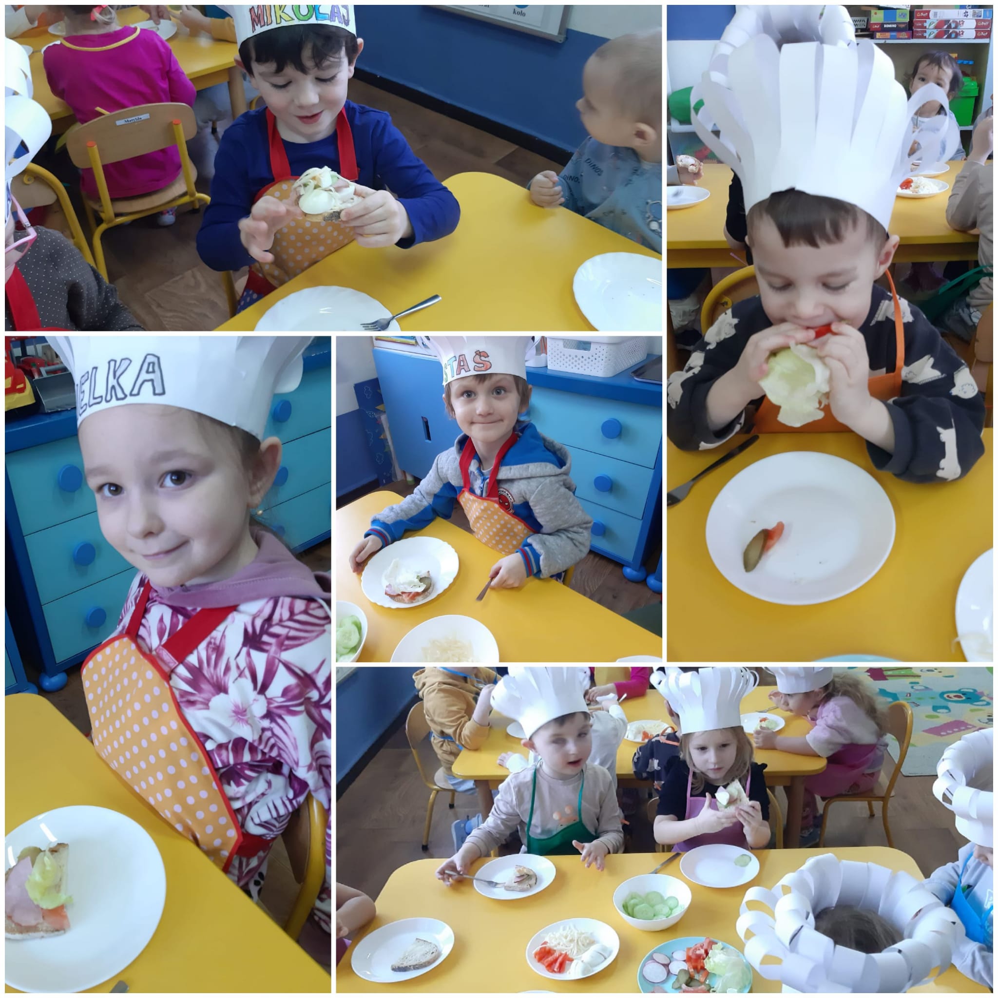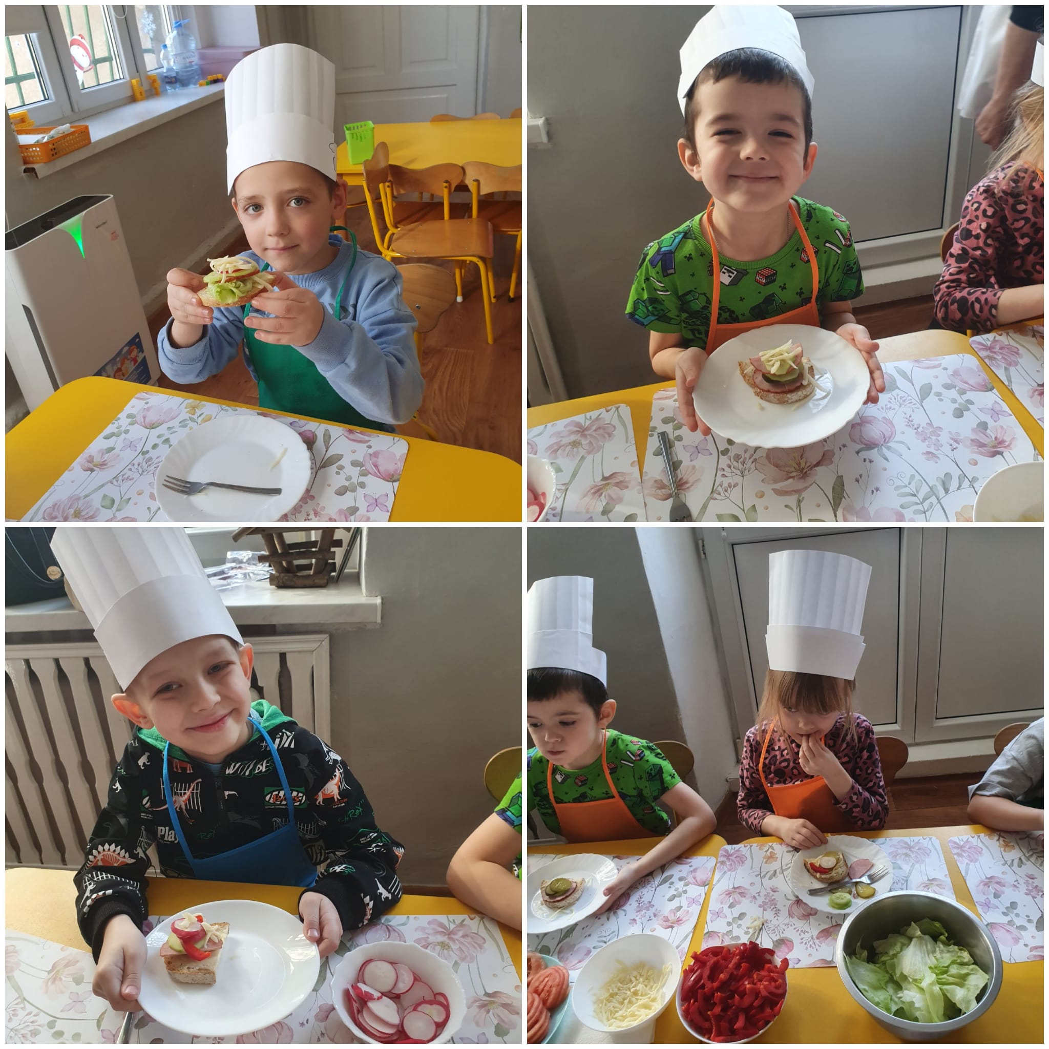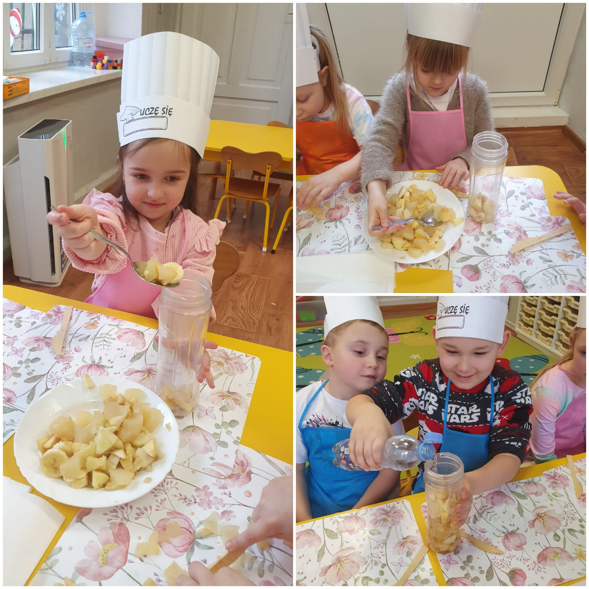 Podczas wspólnych zajęć dzieci miały okazję samodzielnie przygotować zdrowe i smaczne potrawy. Powstały sałatki owocowe, zdrowe koktajle, szaszłyki owocowe oraz kolorowe, pełnowartościowe kanapki. Na zakończenie mali kucharze przygotowali pizzę.